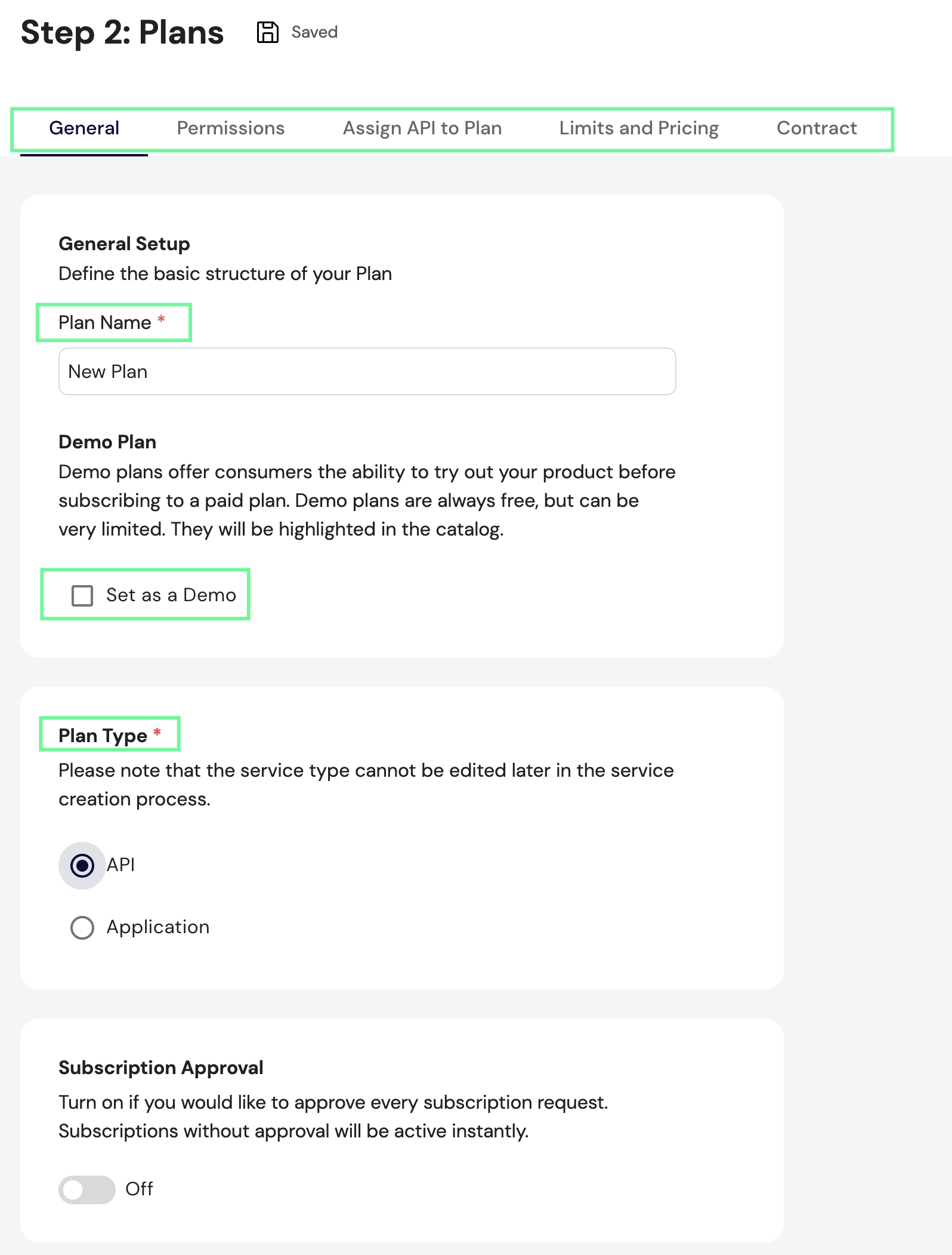 * Mark the **Set as a Demo** checkbox if appropriate. A demo plan is a free plan to which users can subscribe so that they can try out your service (for example, for testing and integration purposes). Demo plans are highlighted in the marketplace. \